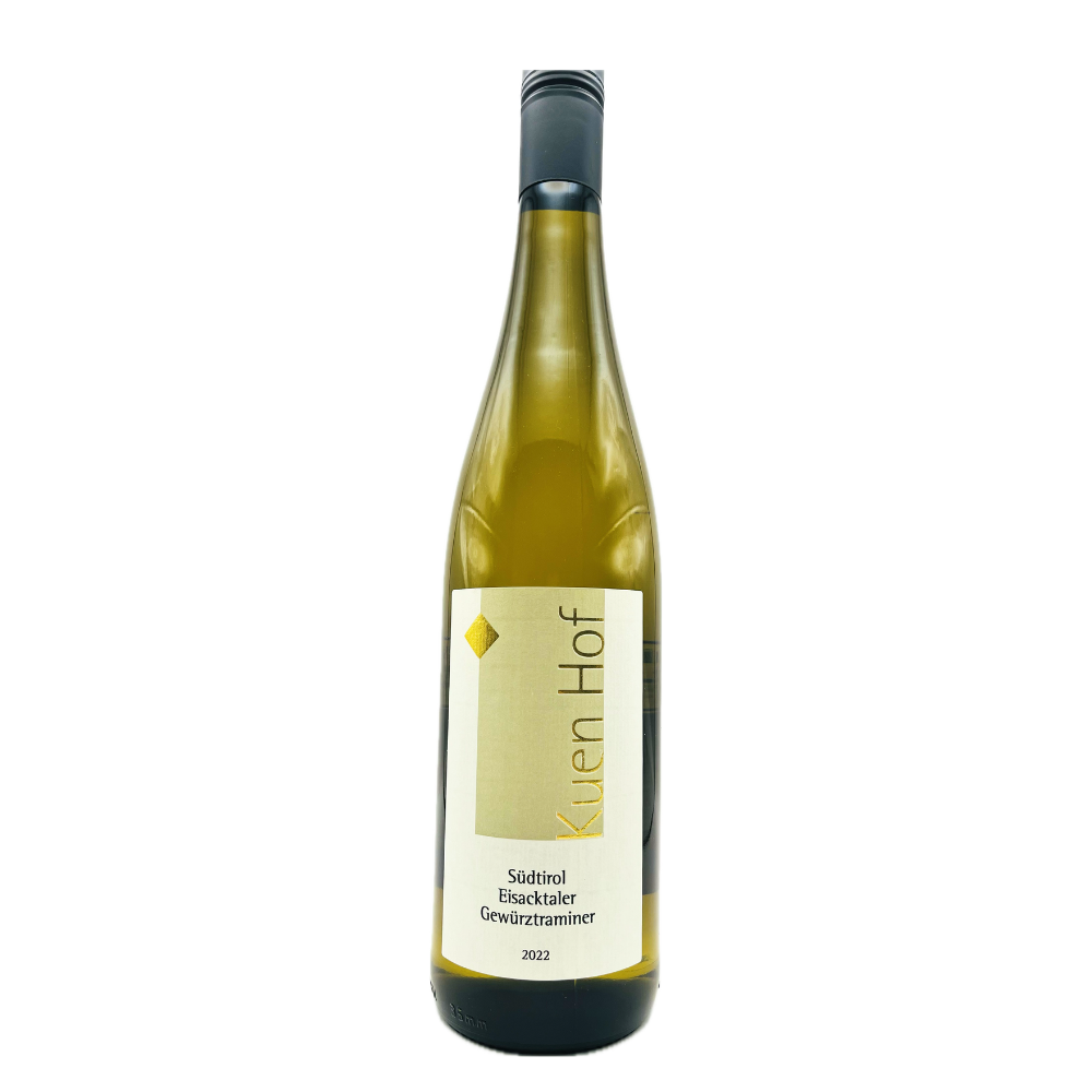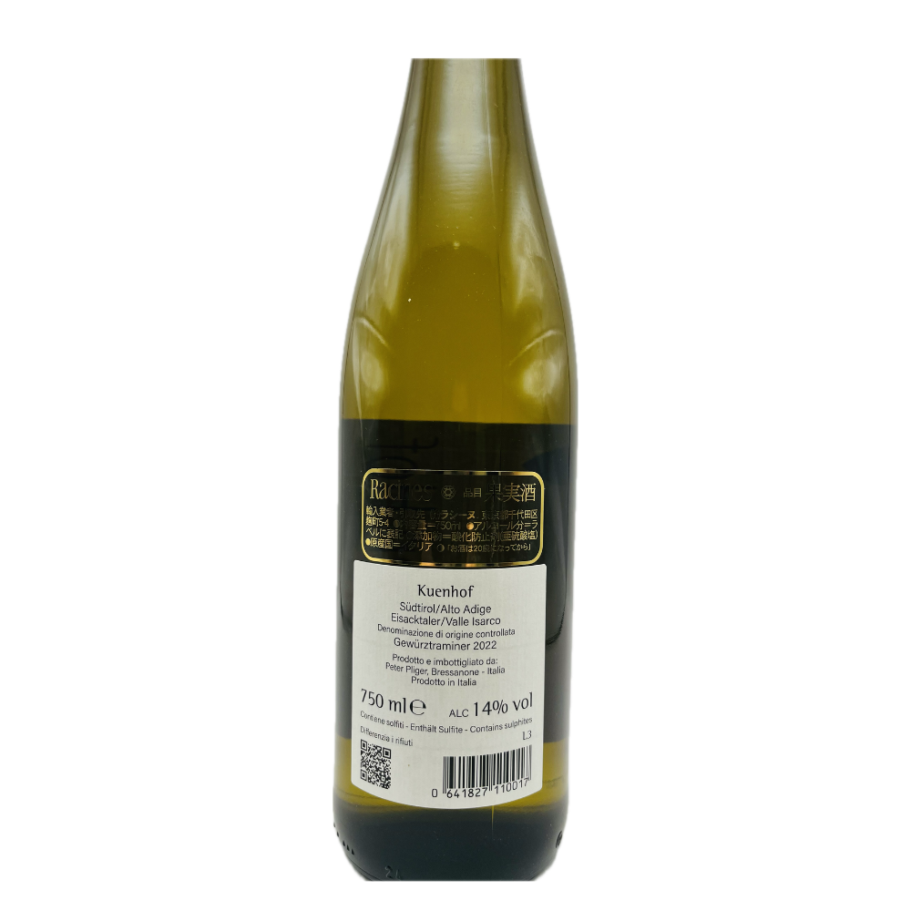 クエンホフは、南チロル地方イザルコ渓谷に位置する家族経営のワイナリーである。1990年にピーターとブリギッテ・プリガー夫妻が創業し、2025年から長男シモンが正式に当主を継いだ。標高550〜890mの急斜面にある畑は、300日を超える日照と昼夜20度の寒暖差を特徴とし、粘土質にシストや石英を多く含む土壌がワインに張りのある酸とミネラルを与える。バイオロジック栽培を行い、段々畑に整備されたブドウ畑は、急斜面ゆえに手作業も必然的に多い。栽培品種はヴェルトリーナー、シルヴァネール、ゲヴュルツトラミネール、リースリングの4種。リースリングは「カイトン」と名付けられ、この地にDOC認定をもたらした品種である。セラーはかつて馬小屋だった建物を改装したもので、自然酵母発酵、マロラクティック発酵なし、シュール・リーで5〜7か月静かに熟成。アカシア材の古樽(一部オーク材)を用い、樽香を抑えた清澄な味わいを生む。